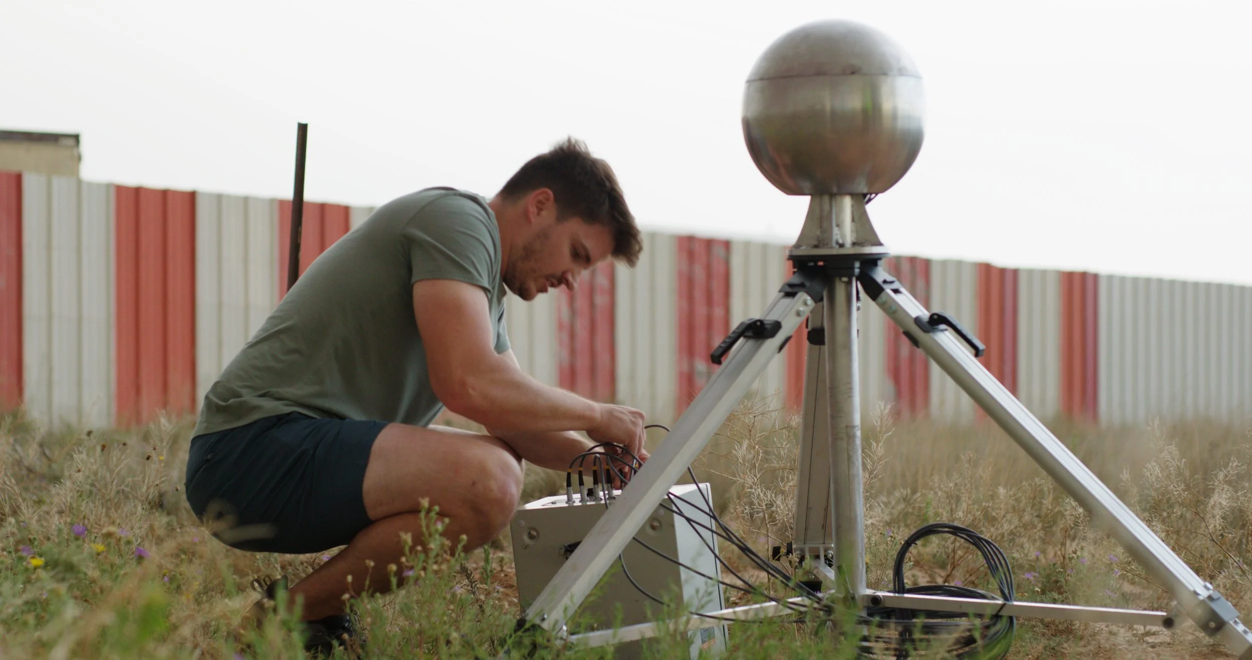 As the experimentation phase comes to a head, a transition to life outside of the facility will fill the screen. Scars of a recent wildfire in a forest, houses demolished in the wake of a hurricane, and golf ball sized hail strewn on sidewalks, allow the viewer to piece together that this work is purposeful and urgent. As this montage unfolds, several familiar faces seen in the research facility begin to appear as they survey collapsed houses in buildings at the site of a recent hurricane, and separately collect hail samples from a passing storm. Ultimately the “reveal” of these moments outside of the research facility will reinforce that the experiments conducted in the test chamber are not just simulations, but rooted in actuality.